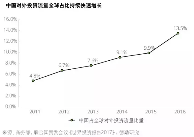 據(jù)悉,預(yù)計(jì)未來(lái)5年,中國(guó)將進(jìn)口8萬(wàn)億美元的商品、吸收6,000億美元的外來(lái)投資,對(duì)外投資總額將達(dá)到7,500億美元,出境旅游將達(dá)到7億人次。結(jié)合全球經(jīng)濟(jì)形勢(shì)、“一帶一路”倡議、監(jiān)管政策以及創(chuàng)新技術(shù)影響,我們對(duì)2018年海外投資趨勢(shì)有如下觀點(diǎn):