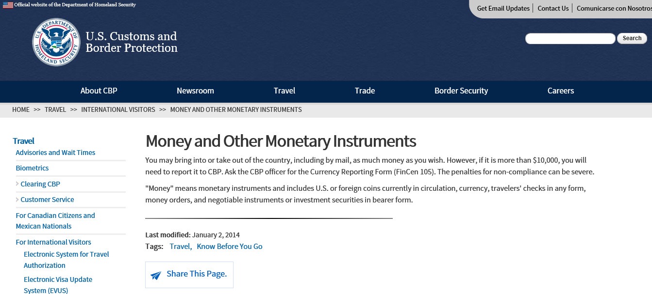 美國(guó)海關(guān)及邊境保護(hù)局(CBP)規(guī)定,游客攜帶超過(guò)1萬(wàn)美元現(xiàn)金、旅行支票或者其它貨幣等,都須向海關(guān)申報(bào),并對(duì)現(xiàn)金的來(lái)源作出合理解釋,例如現(xiàn)金如果來(lái)自所出售房產(chǎn),務(wù)必出示出賣房產(chǎn)的憑據(jù)等。如不申報(bào),當(dāng)事人最高可面臨50萬(wàn)美元的罰款及10年以上有期徒刑。