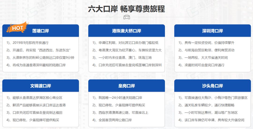 引入相關(guān)城際軌道線路,實(shí)施站城一體化開(kāi)發(fā),皇崗口岸目前正在構(gòu)筑一個(gè)跨境樞紐,未來(lái)交通只會(huì)更為方便,甚至可能成為中國(guó)香港連接大灣區(qū)的重要樞紐,隨著皇崗口岸的周邊配套的愈加完善及在深港創(chuàng)新特別合作區(qū)的助推下,不難預(yù)測(cè),未來(lái)皇崗口岸的粵港車牌價(jià)值將重估,對(duì)有需要辦理粵港車牌的客戶來(lái)說(shuō)無(wú)疑是一個(gè)搶先辦理的好時(shí)機(jī)。