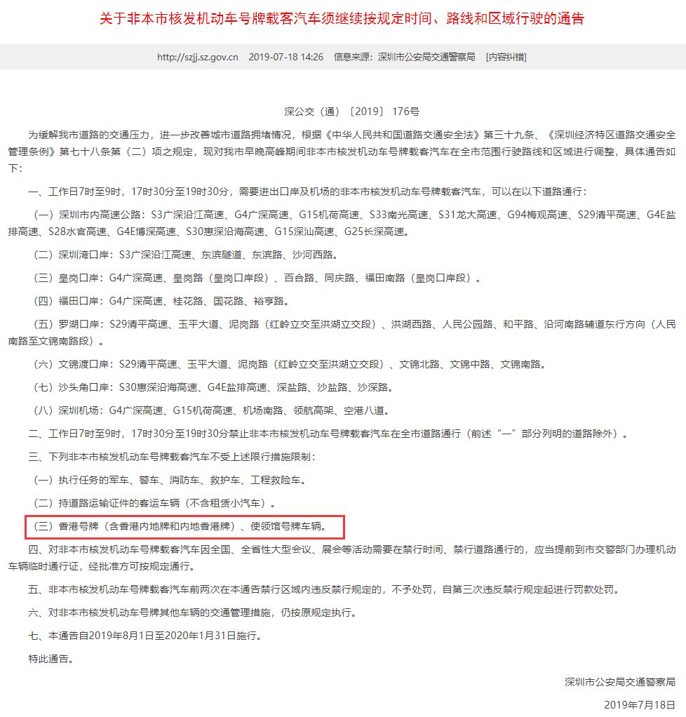2019年1月18日,深圳市公安局交通警察局在其官網(wǎng)發(fā)布《關(guān)于非本市核發(fā)機動車號牌載客汽車須繼續(xù)按規(guī)定時間、路線和區(qū)域行駛的通告》。