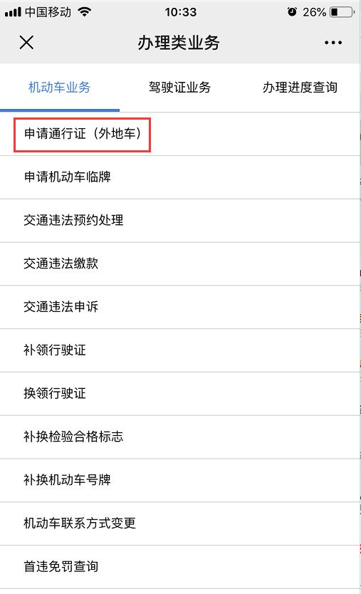 關(guān)注公眾號【深圳交警】點擊【星級用戶】進入頁面,然后點擊【辦理類業(yè)務(wù)】,進入后點擊【申請通行證(外地車)】即可申請。