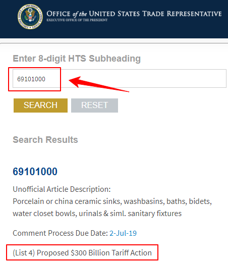 以陶瓷衛(wèi)浴制品(HTS CODE:69101000)為例,在搜索框輸入8位的HTS CODE,可以發(fā)現(xiàn),它屬于第四輪加稅產(chǎn)品。
